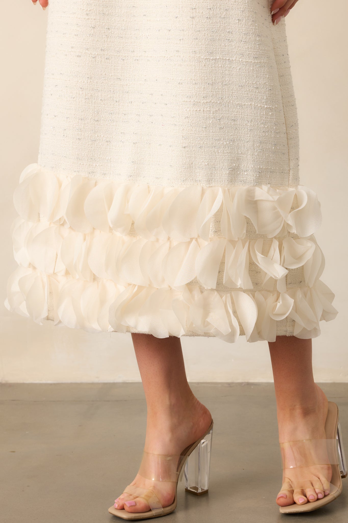 The Caught In The Moment Ivory Tweed Strapless Midi Dress is the epitome of elegance and sophistication. With its timeless tweed fabric and refined details, this dress effortlessly blends classic charm with modern grace, perfect for any occasion that calls for a polished touch. This ivory dress features a strapless neckline, a non-slip strip along the top interior hem of the bust, a hidden back zipper closure, midi length, silver tinsel details throughout, and a 3D petal bottom tier.
