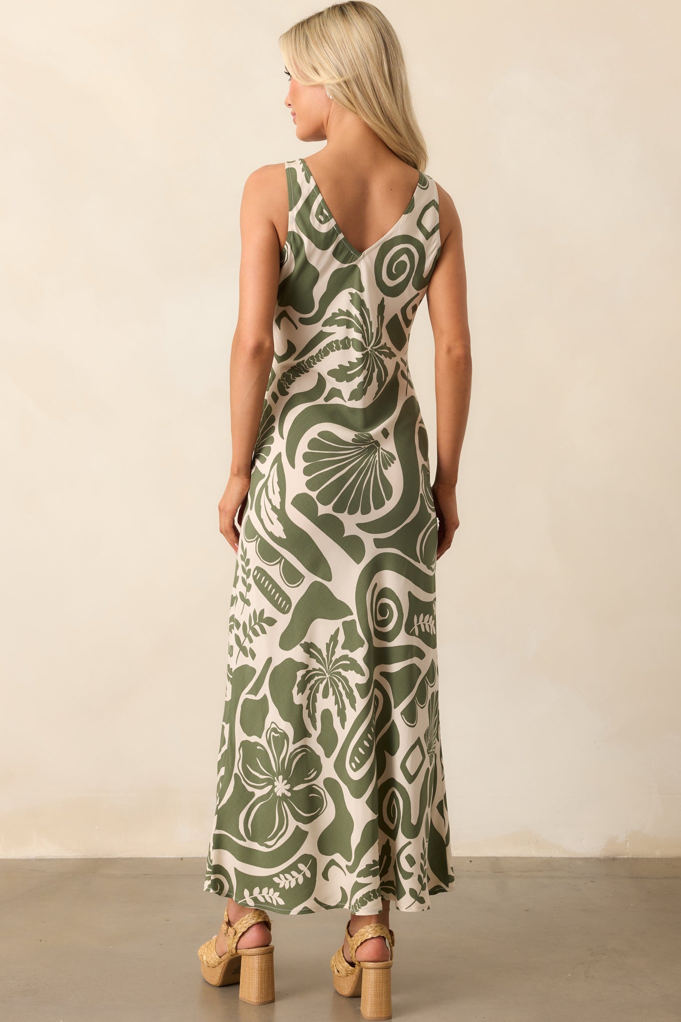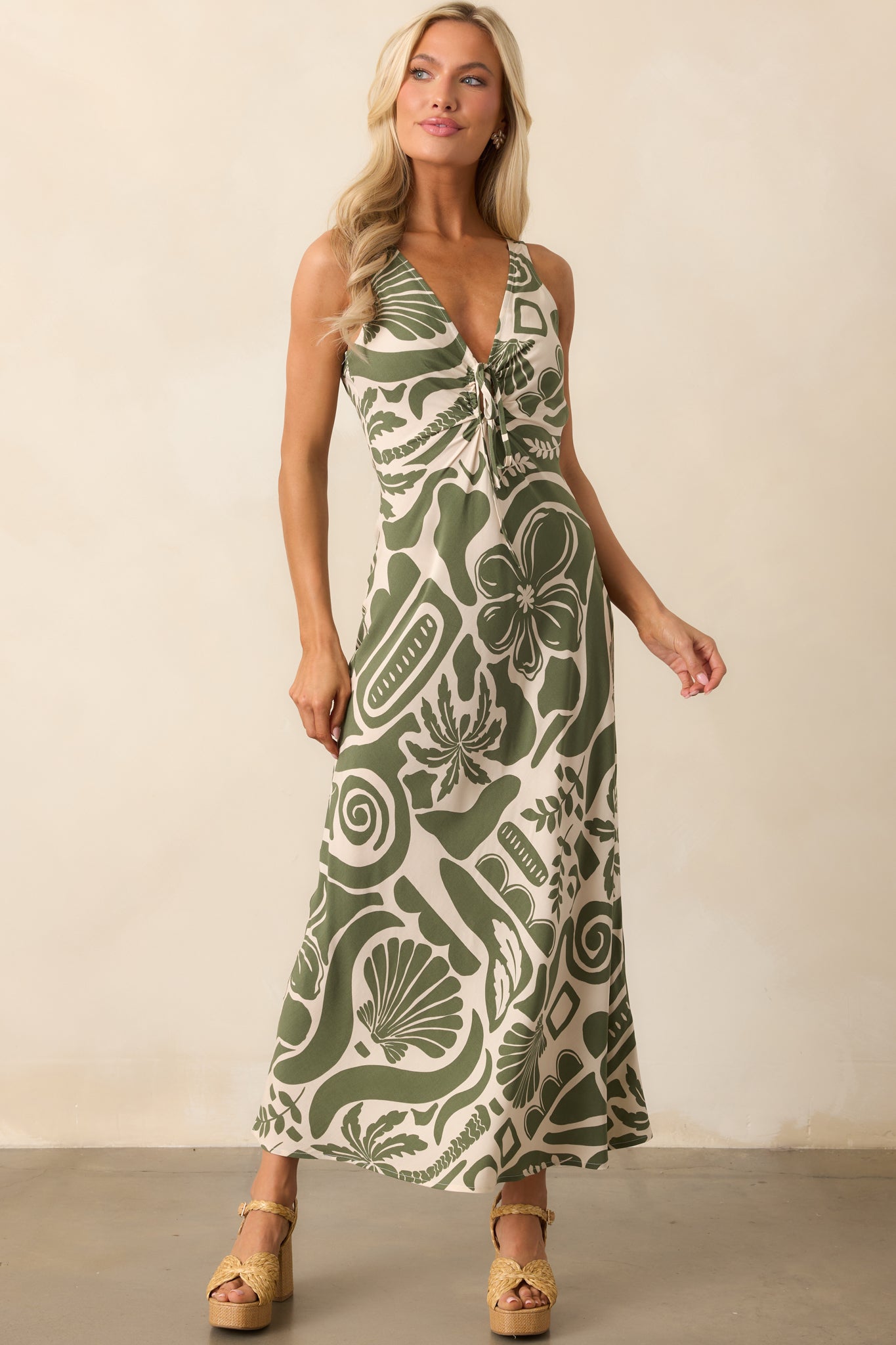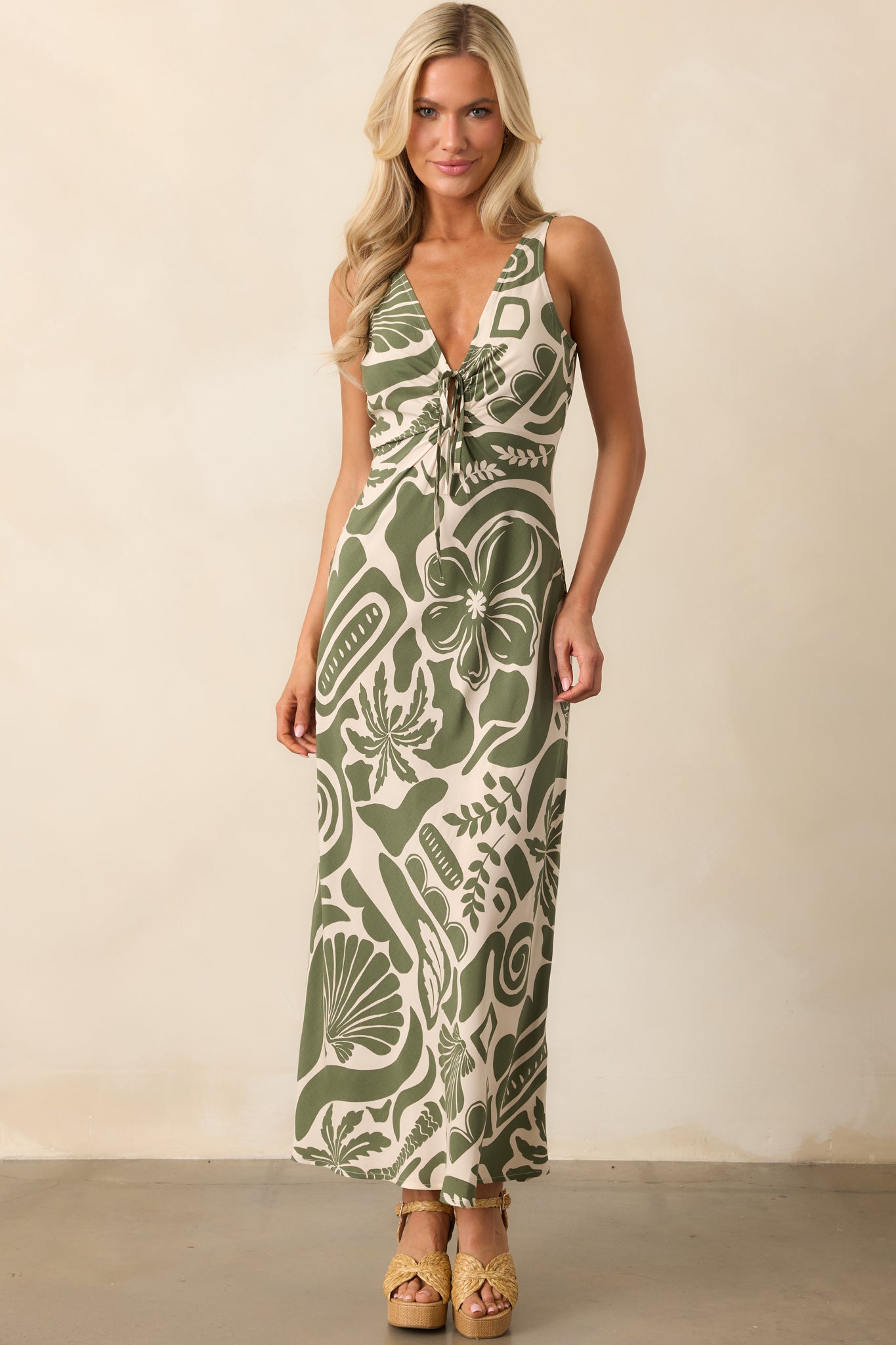 The MINKPINK Green Amos Keyhole Midi Dress is a statement piece designed for effortless style. It's perfect for those who want to make a stylish impression with a touch of elegance. This midi dress features an ivory and green tropical print, a v-neckline with an adjustable self-tie keyhole closure, sleeveless design, and a hidden side zipper.