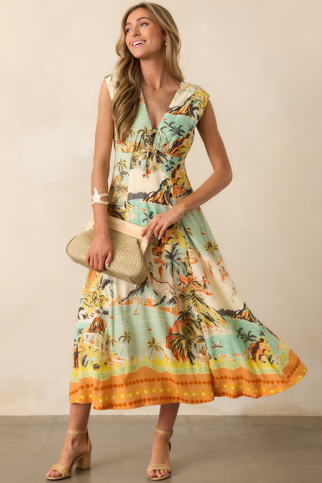 The MINKPINK Yellow Green Vacanza Midi Dress is a vibrant choice for embracing the joy of a sunny escape. Its bright colors and playful design make it perfect for those moments when you want to feel carefree and radiant, capturing the essence of a lively getaway. This midi dress features a yellow-green and orange hue tropical beach print, a v-neckline, adjustable self-tie front with bead stoppers, cap sleeves, and a hidden back zipper.