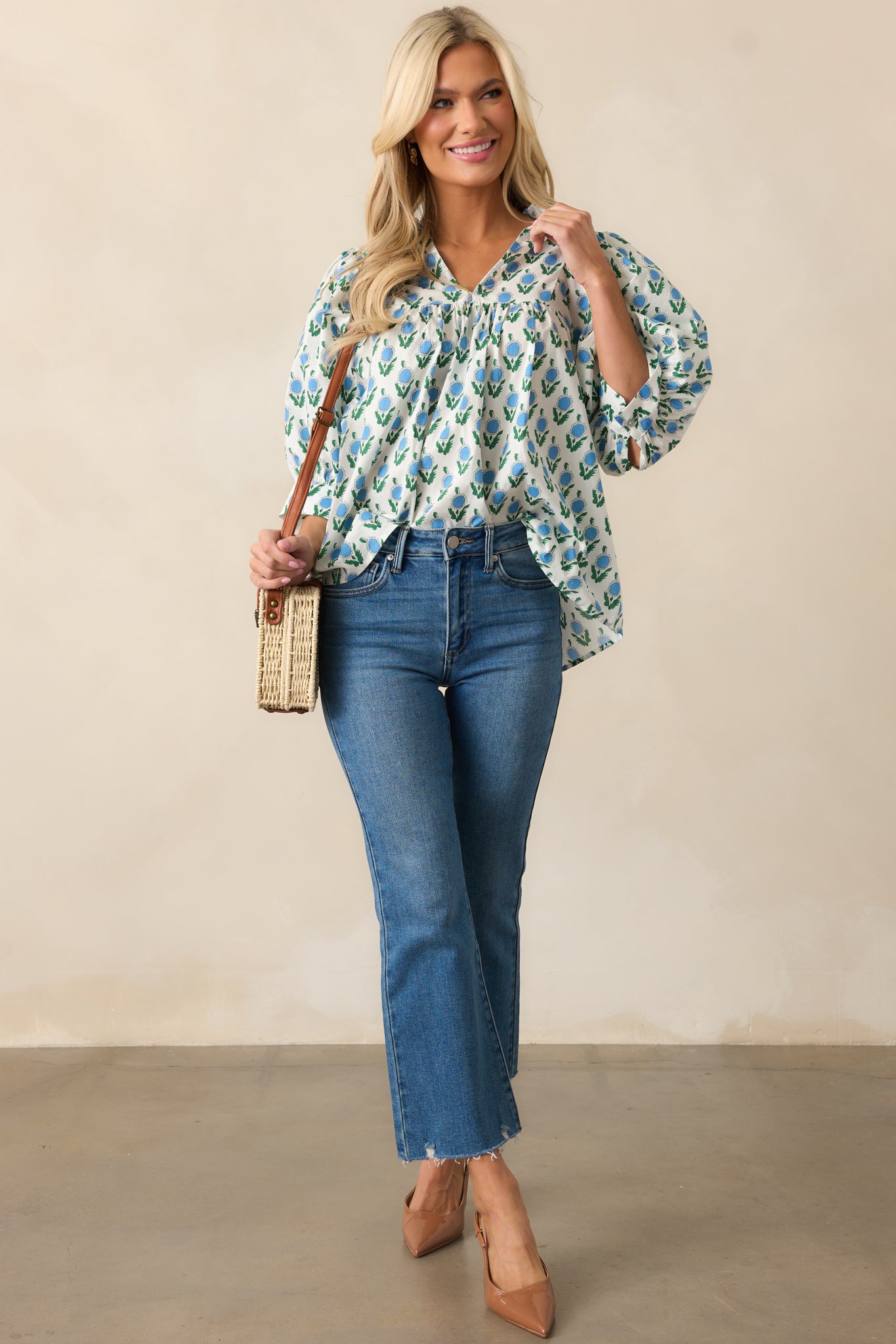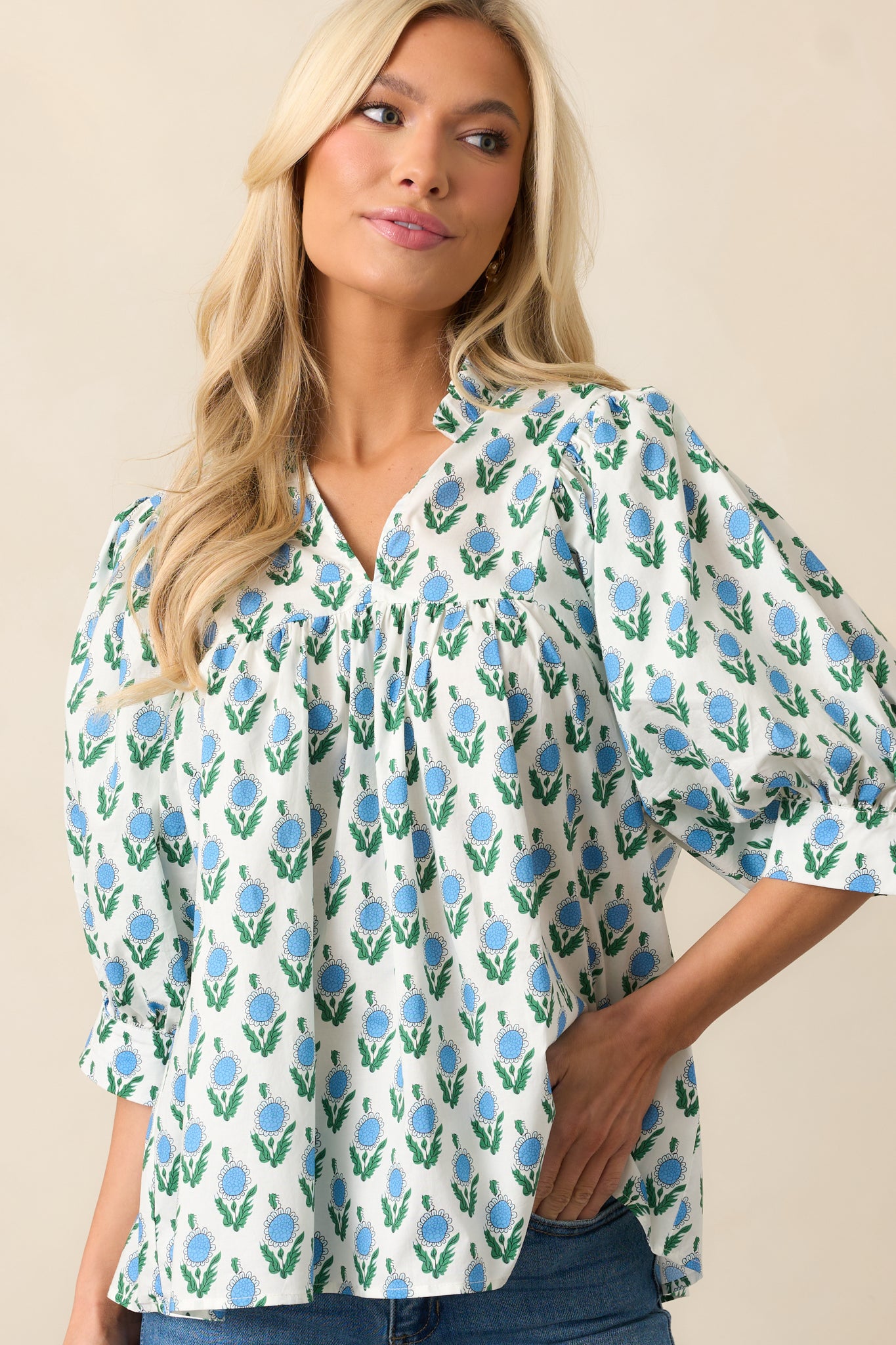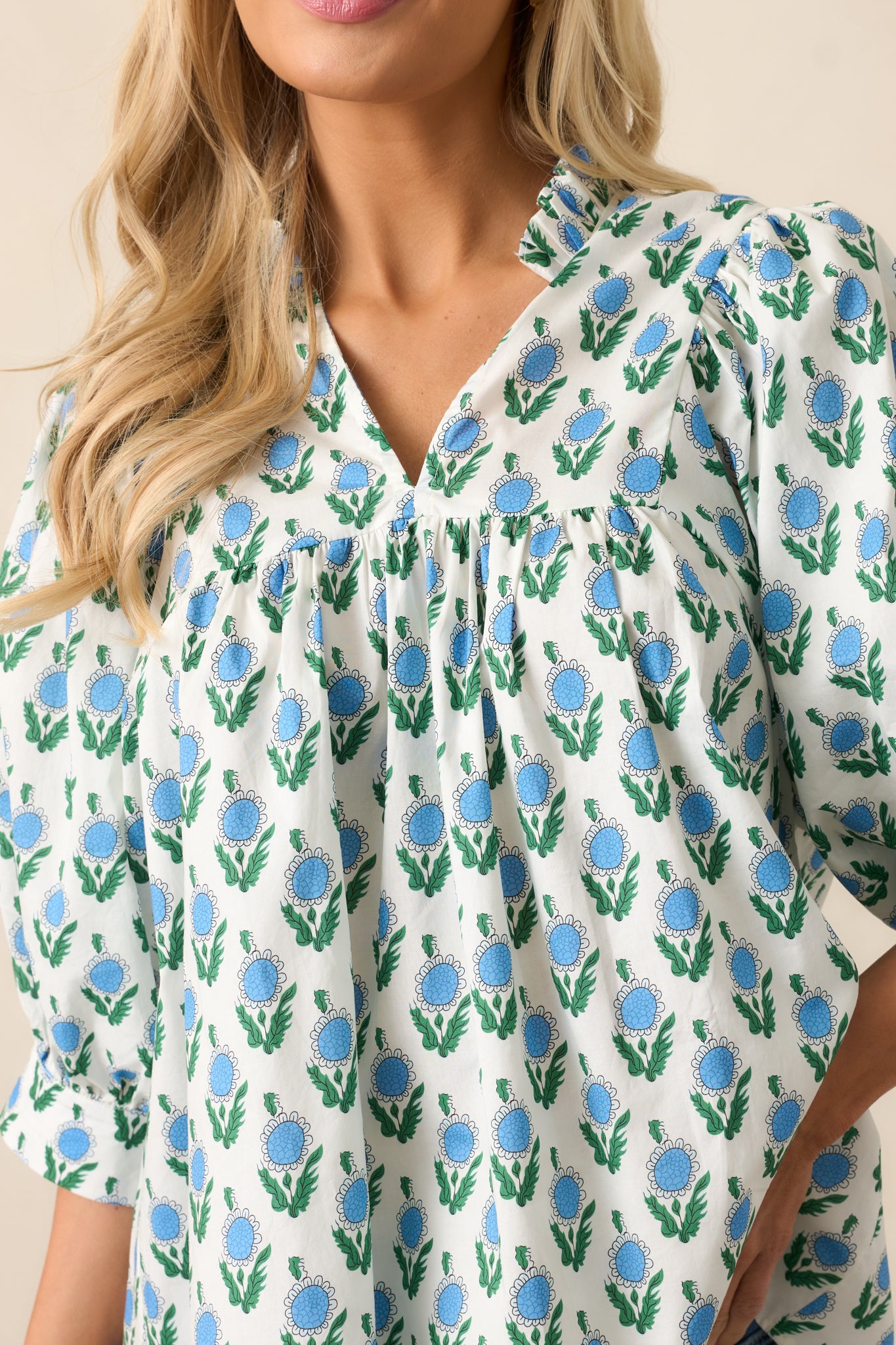 Embrace leisurely style with the Slow Mornings Blue Floral Cotton Puff Sleeve Top. This charming piece is perfect for a weekend brunch or a farmers market visit. Its blue floral print and puff sleeves create a fresh and feminine look, ideal for enjoying those relaxed moments in comfort and style. This blue top features a floral print, a notch v-neckline, ruffle trim along the neckline, and half length puff sleeves.