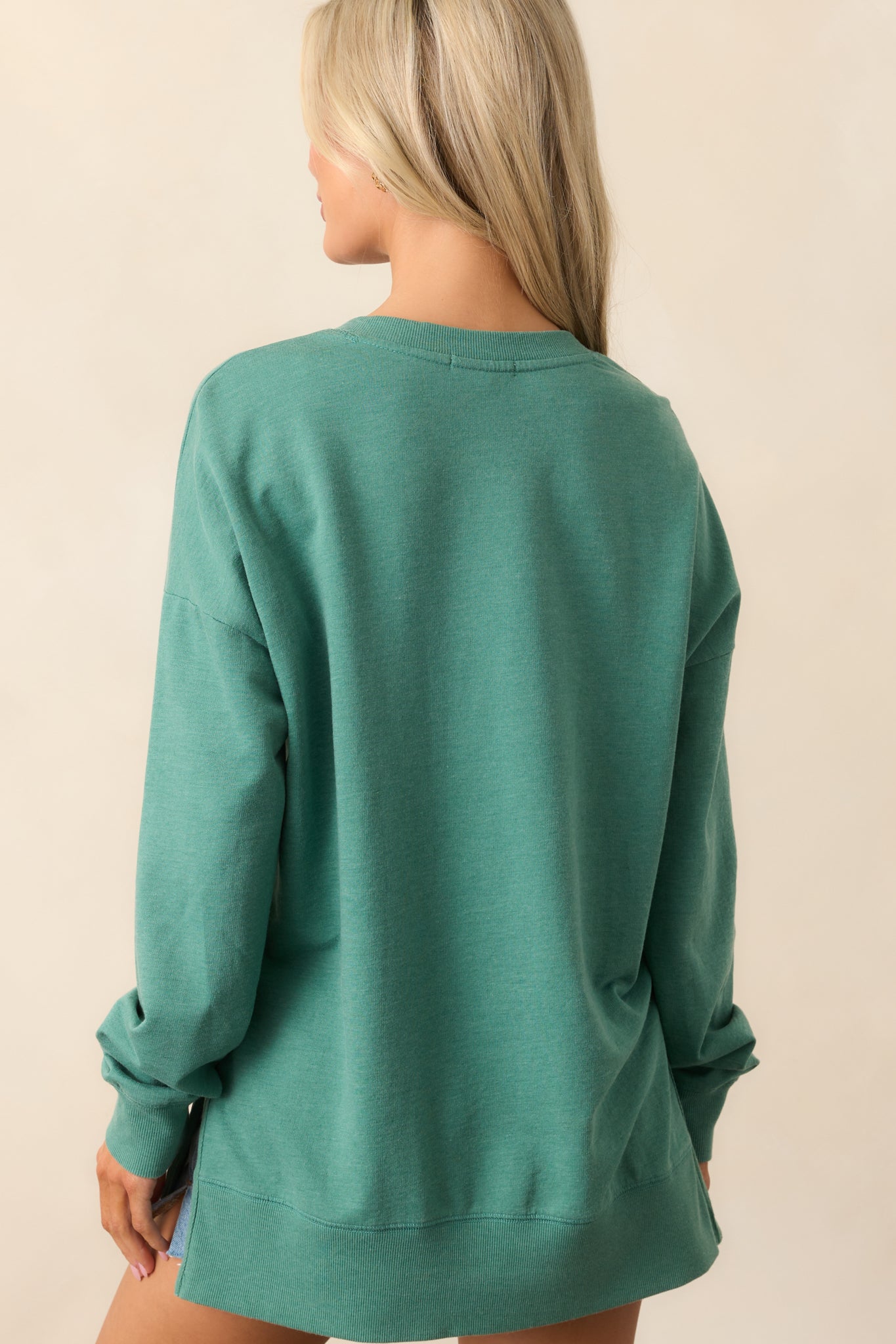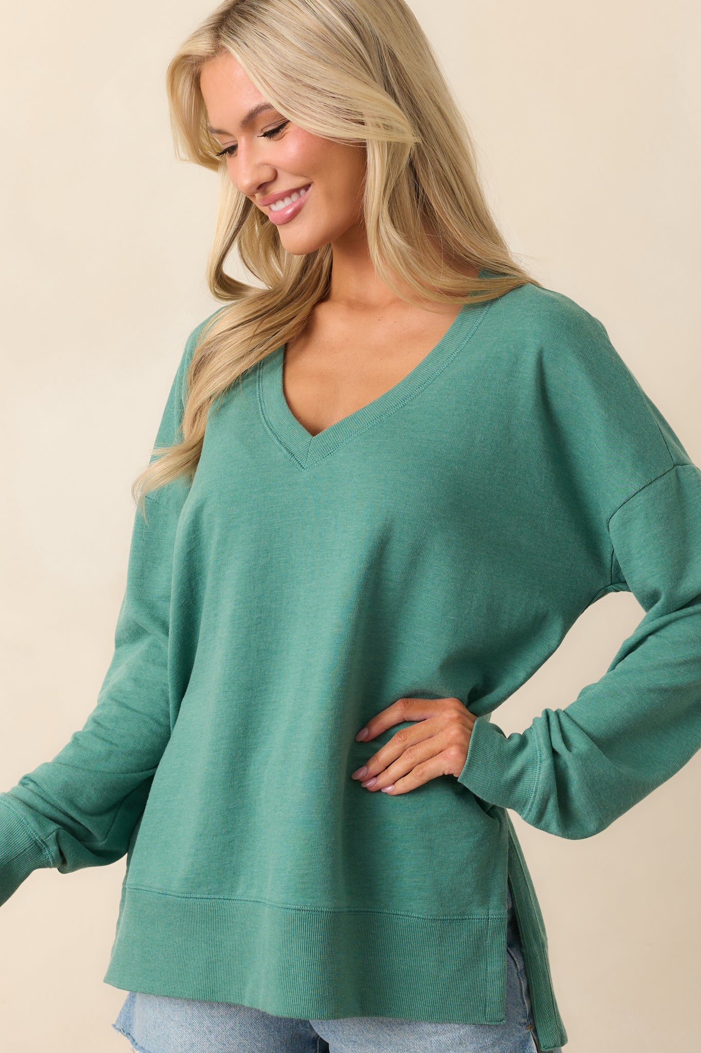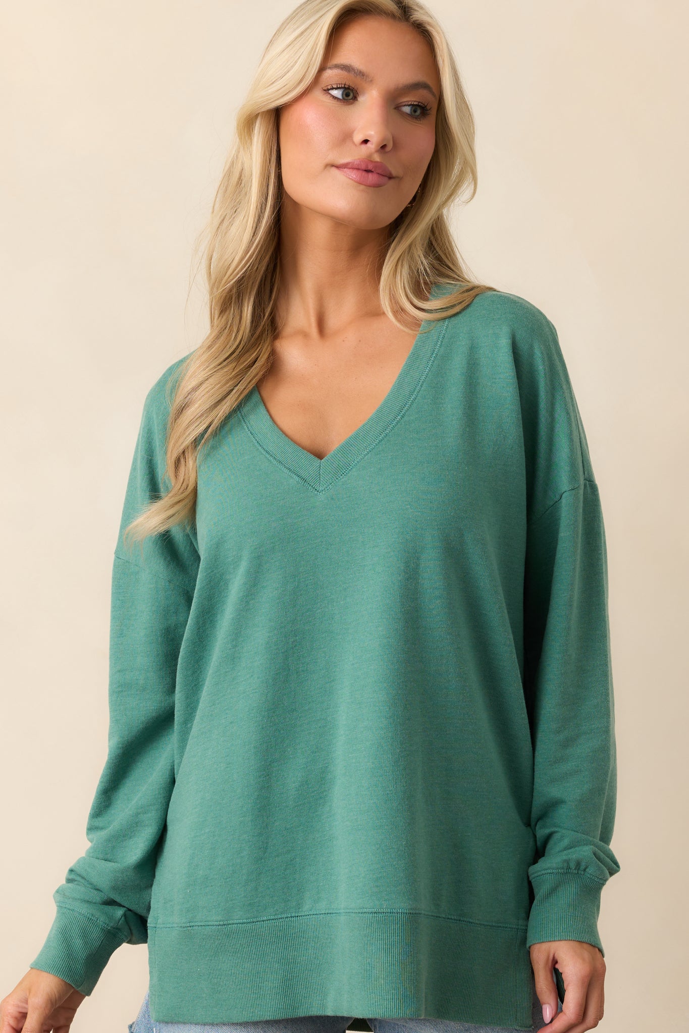 Wrap yourself in comfort with the Z Supply Botanical Green Modern V-Neck Weekender. This charming piece is perfect for a casual day out or a relaxed evening with friends. Its botanical green hue and relaxed fit create a fresh and laid-back vibe, ideal for enjoying everyday moments in style and comfort. This botanical green sweatshirt features a v-neckline, long sleeves, ribbed hems, an oversized silhouette, and side vent slits.